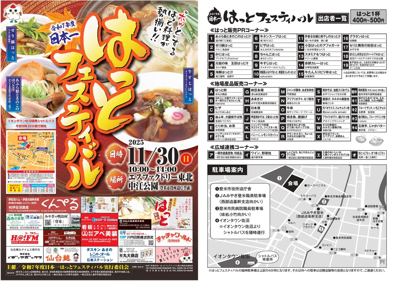 今年は定番の「あぶら麩ときのこのはっと汁」、「せり香る牡蠣と煮干しのはっと汁」、「かにはっと」、「牛すじはっと」のほかに、「ピザはっと」や「グラタンはっと」など19種類のはっと汁を堪能できます。