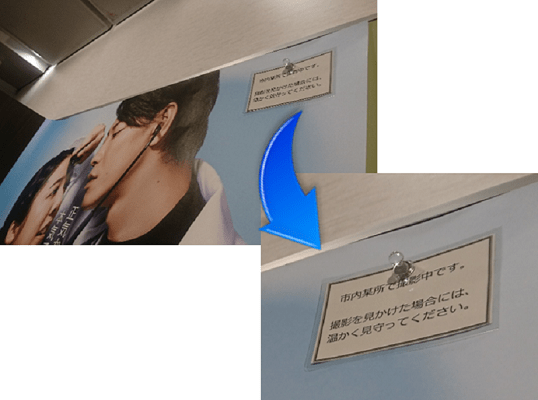 ●最新ドラマのポスターを掲示し、「市内某所で撮影中。撮影を見かけた場合には、温かく見守ってください」と案内。