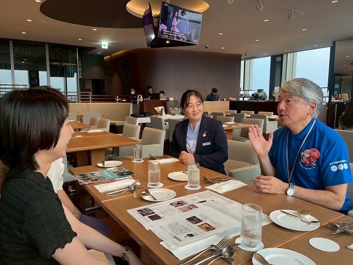 お客様にとっても、スタッフにとってもデスティネーション(=目的地)になることを目指して、二子玉川エクセルホテル東急に泊まってみたい、ここで働きたいと思ってもらうには「ロケ」の活用が不可欠と語る河内総支配人(青いポロシャツ)とロケ担当の芹沢さん。